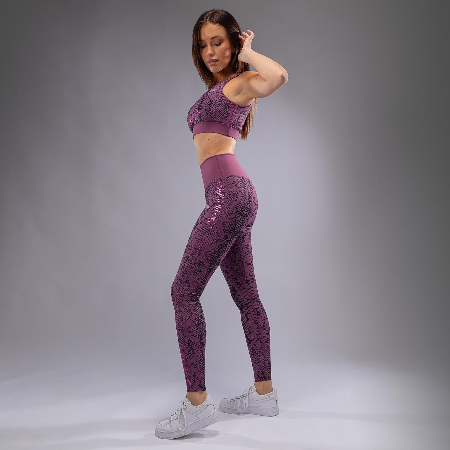 Le soutien-gorge de sport pour femmes offre un design asymétrique audacieux avec des bretelles entrelacées, dans une palette violette métallique qui revisite le motif de peau de serpent. Parfait pour le sparring, le cardio et la gym, ce soutien-gorge à impact moyen se marie à merveille avec un legging assorti.