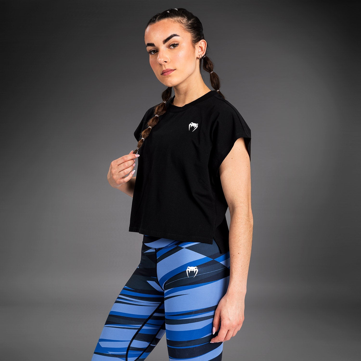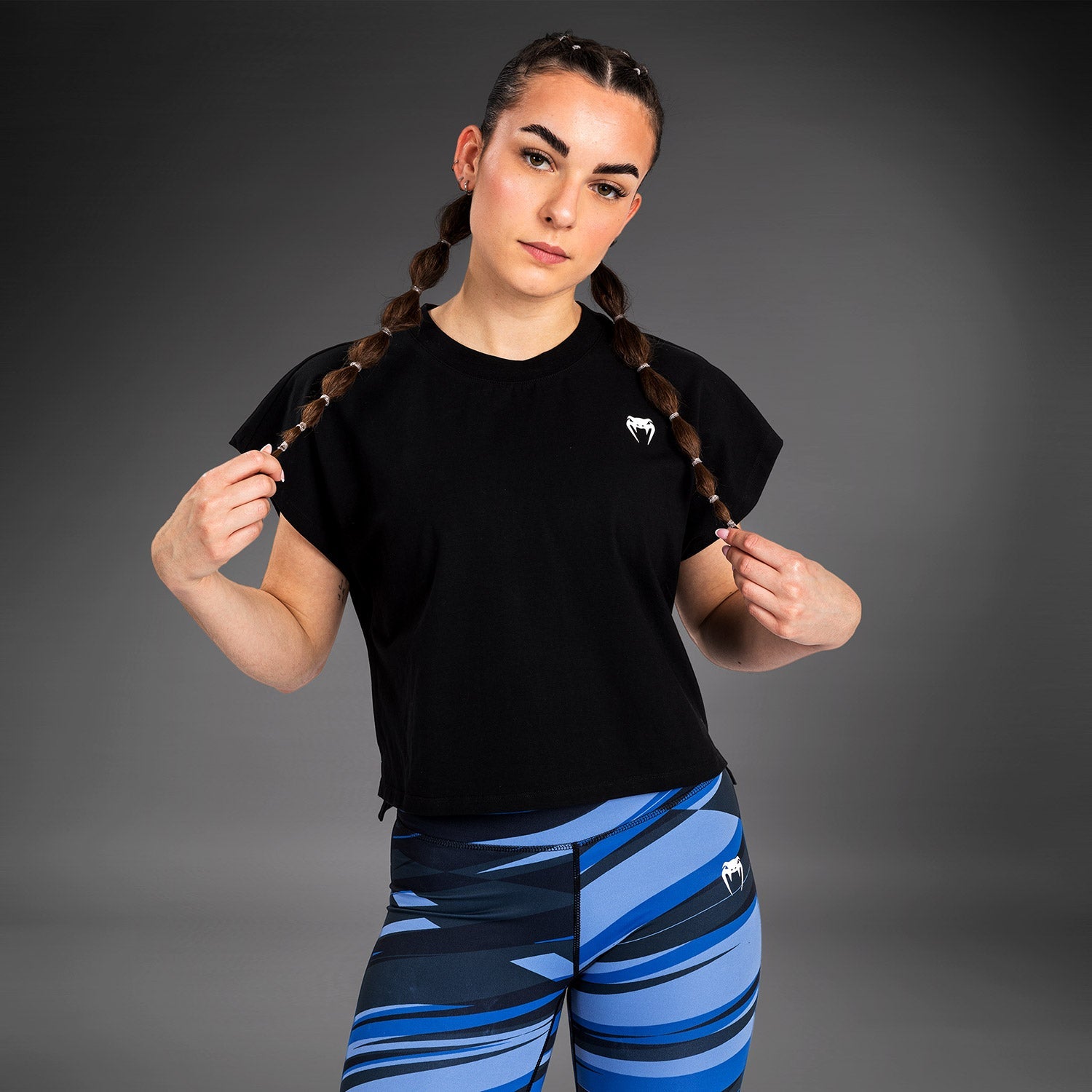 Le crop top pour femmes Venum Abyss est un t-shirt en coton de haute qualité avec juste ce qu'il faut d'extensibilité. Le logo Venum sur la poitrine présente le même imprimé bleu et noir accrocheur que l'ensemble de la collection Abyss.