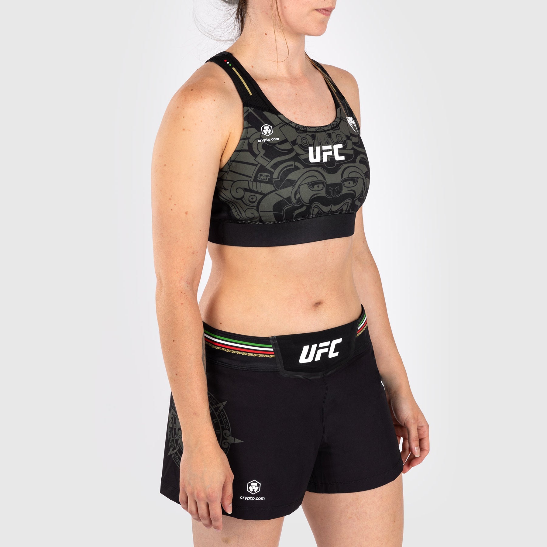 Le soutien-gorge de sport Noche UFC Authentic Fight Night par Venum pour femmes en noir présente cinq dieux aztèques primordiaux sur la poitrine. Les têtes d'aigle s'étendant de chaque côté du graphique représentent Itzcuauhtli, symbolisant la résilience et le dévouement de l'esprit combatif du peuple mexicain.