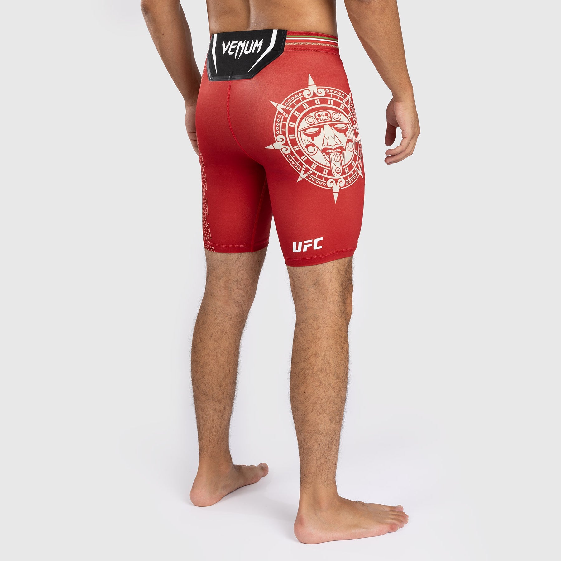 Le short Vale Tudo pour hommes Noche UFC par Venum Authentic Fight Night en rouge présente le graphisme d'une pierre du soleil, mettant en avant le coiffe complexe de Tōnatiuh, la divinité aztèque du jour et de la nuit.