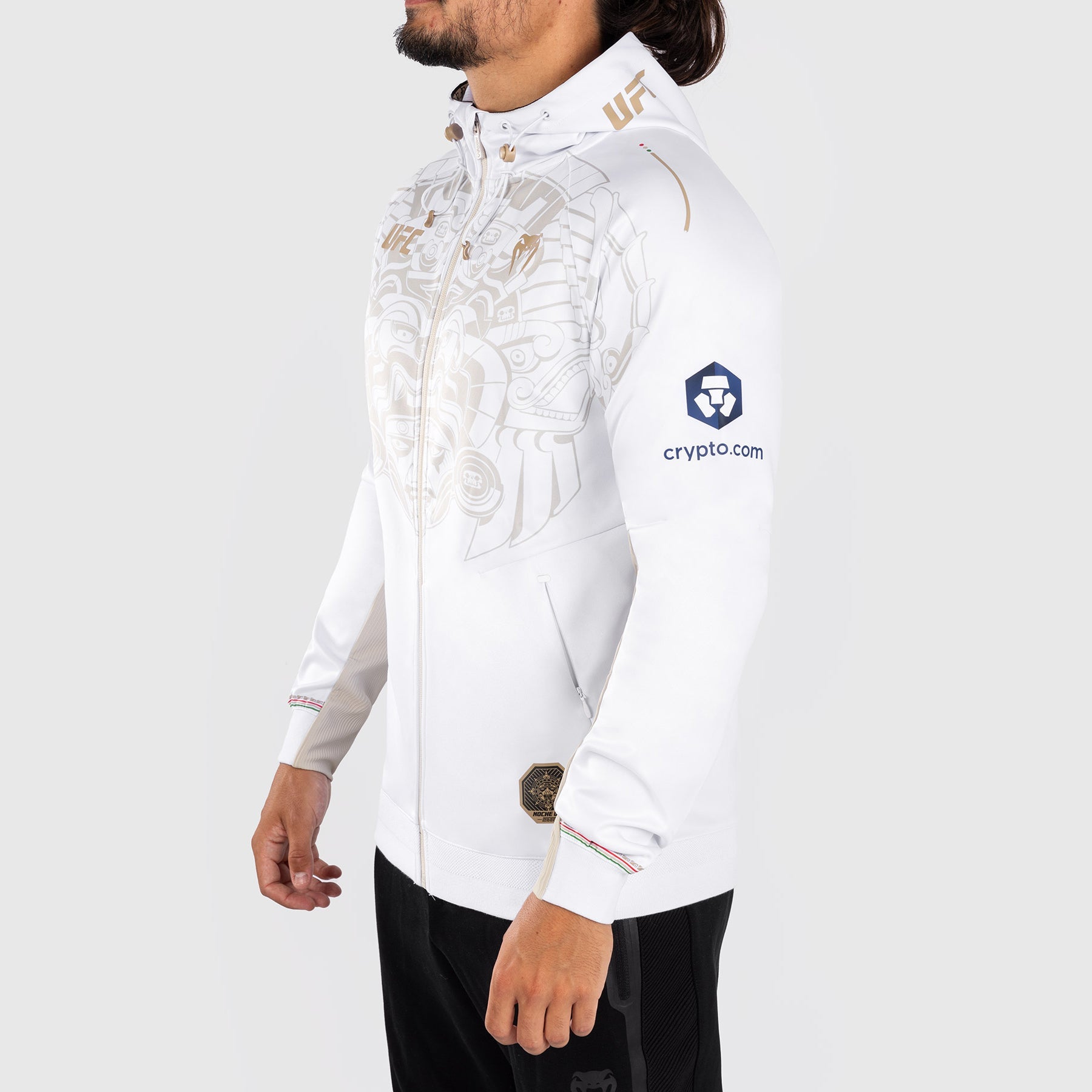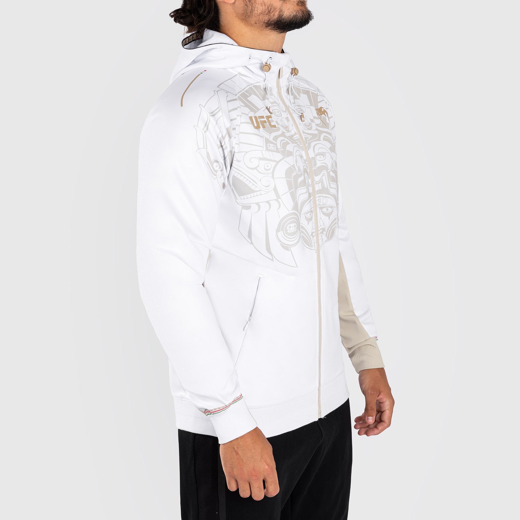 Le Noche UFC Authentic Fight Night par Venum Men’s Walkout Hoodie en blanc présente cinq dieux aztèques primordiaux sur la poitrine et la capuche. Les têtes d'aigle atteignant de chaque côté du graphique représentent Itzcuauhtli, symbolisant la résilience et le dévouement de l'esprit combatif du peuple mexicain.