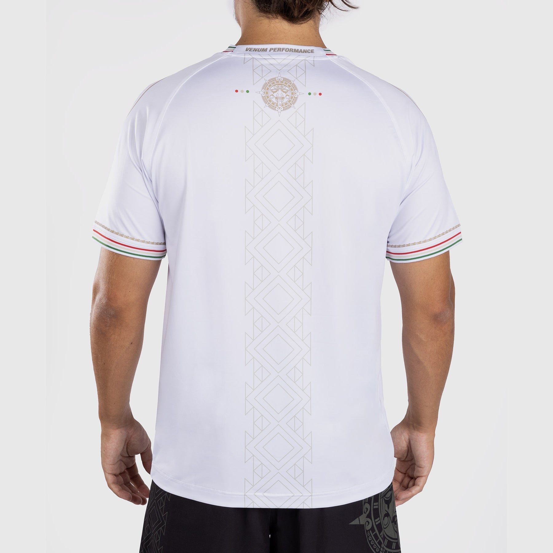 Le Noche UFC Authentic Fight Night par Venum Men’s Walkout Jersey en blanc présente cinq dieux aztèques primordiaux sur la poitrine. Les têtes d'aigle s'étendant de chaque côté du graphique représentent Itzcuauhtli, symbolisant la résilience et le dévouement de l'esprit combatif du peuple mexicain.