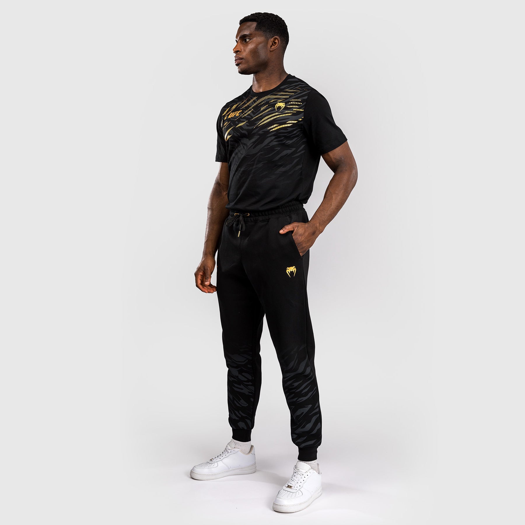 Les détails en blanc du logo Venum et de l'UFC au niveau des hanches ajoutent une touche finale à ces pantalons de survêtement décontractés. Cette combinaison de couleurs noir/or est réservée aux champions de l'UFC.