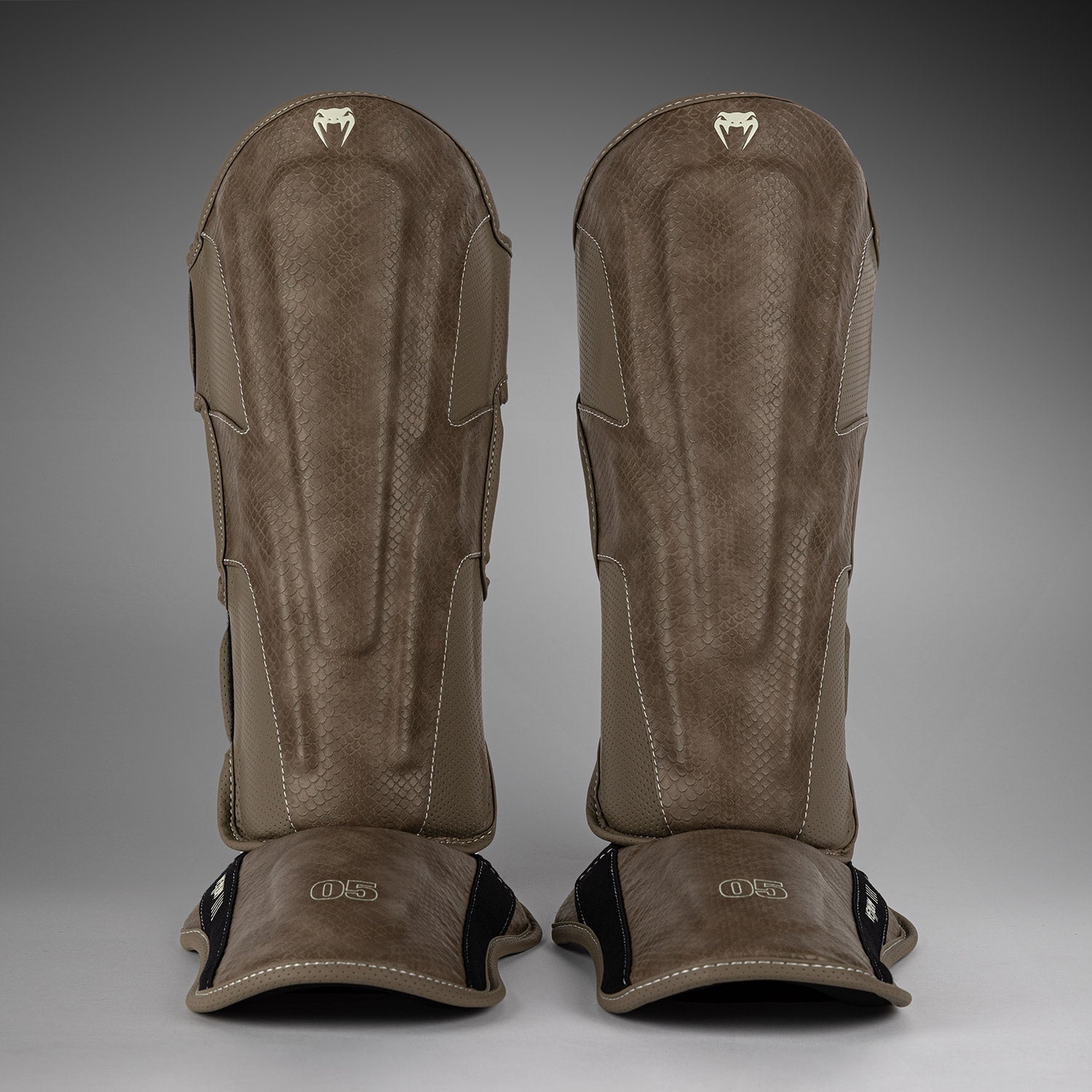 Ces protège-tibias au design percutant se distinguent par des surpiqûres beige qui soulignent leur construction anatomique, apportant un contraste subtil. Leur surface texturée en écailles rappelle l’esprit Venum : frapper fort et vite.