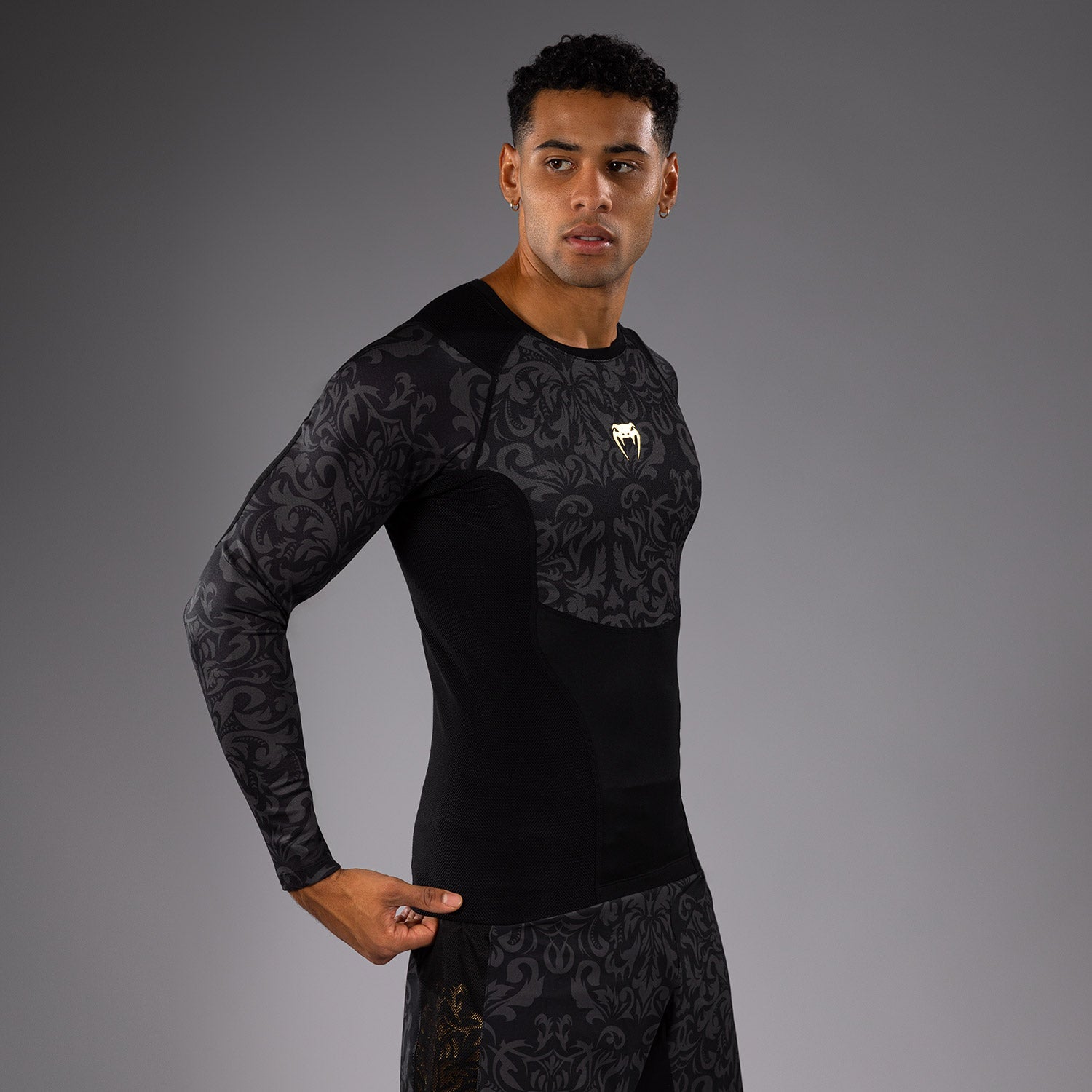 Le motif opulent de cette combinaison noir et or évoque l'ascension spectaculaire et le règne d'un athlète Venum adoré et champion de l'UFC.