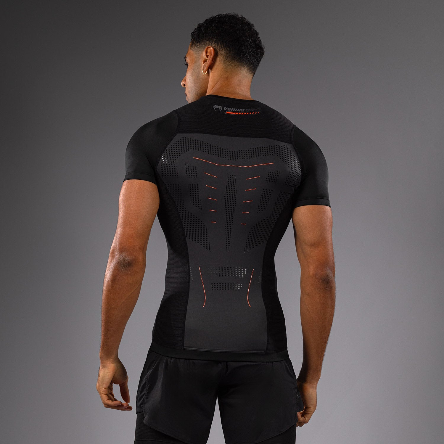 Le Rashguard à manches courtes Venum Technique 3.0 en graphite est un modèle compressif au design futuriste élégant en gris graphite et noir, arborant le logo Venum sur la poitrine.