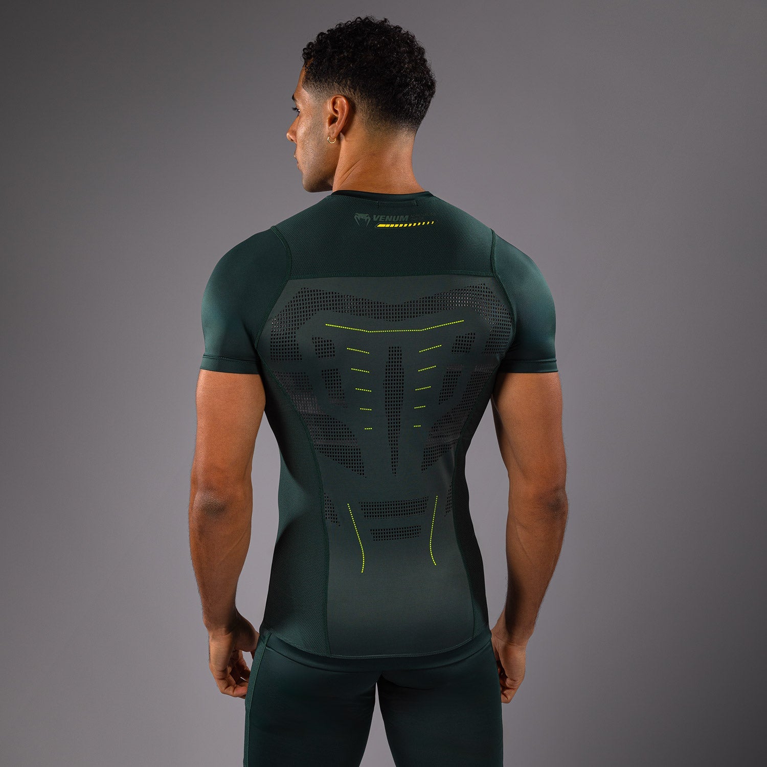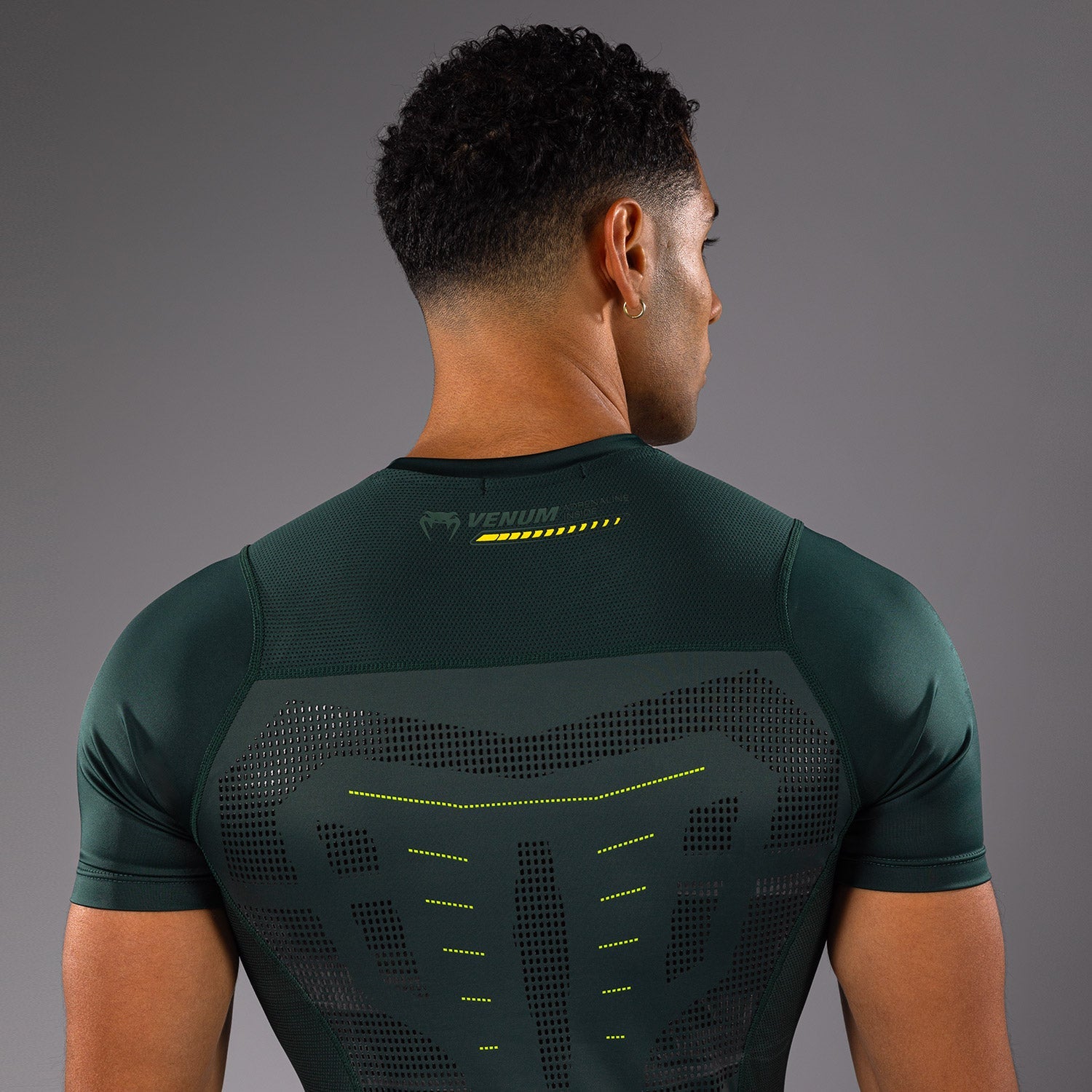 Le Rashguard à manches courtes Venum Technical 3.0 en vert forêt est un rashguard compressif au design futuriste élégant, alliant vert foncé et noir, avec le logo Venum sur la poitrine.