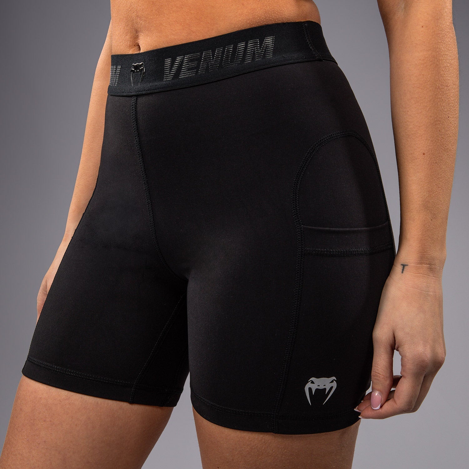 Le short long pour femme Vale Tudo de Venum Elevate en noir est un short de compression classique doté d'une ceinture élastique de soutien, pour un short à la fois féminin et idéal pour les sports de combat et l'entraînement.