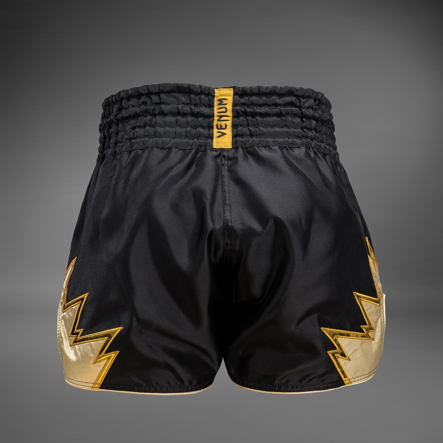 Un patch réfléchissant doré avec le logo "Venum" est placé sur le devant du short et sur la ceinture avant. Pendant ce temps, des flammes, également en doré, montent sur les côtés des shorts.