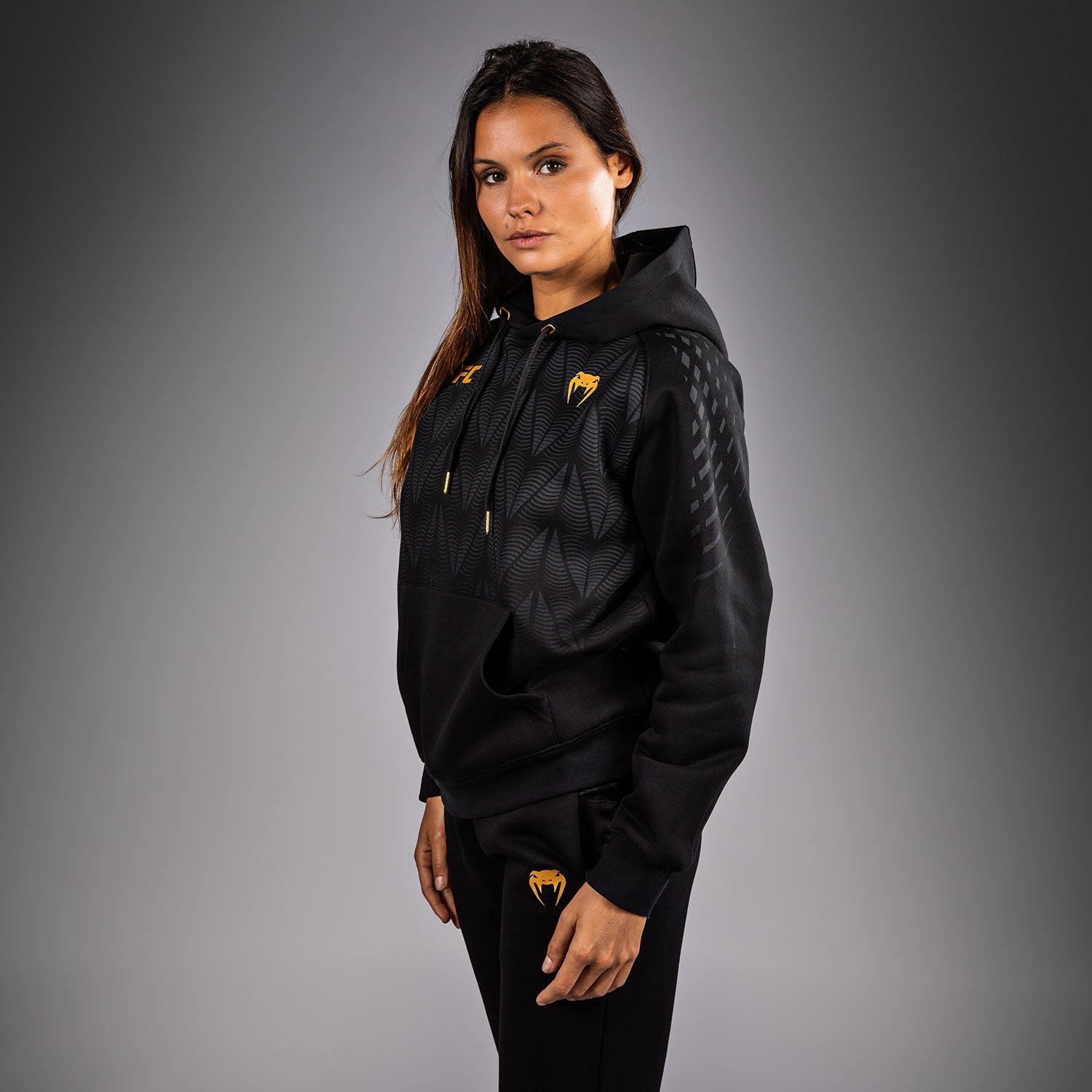Le sweat à capuche femme UFC Zenith by Venum Replica propose une poche kangourou frontale et une capuche avec cordon de serrage. Les logos Venum et UFC ornent la poitrine et la capuche.