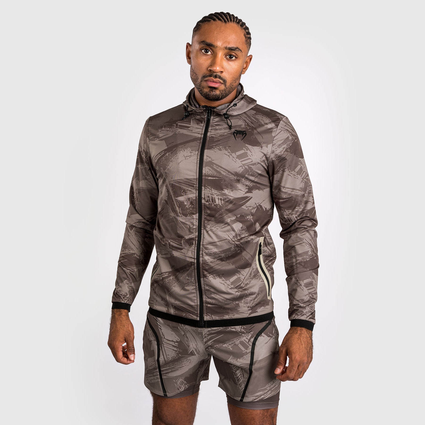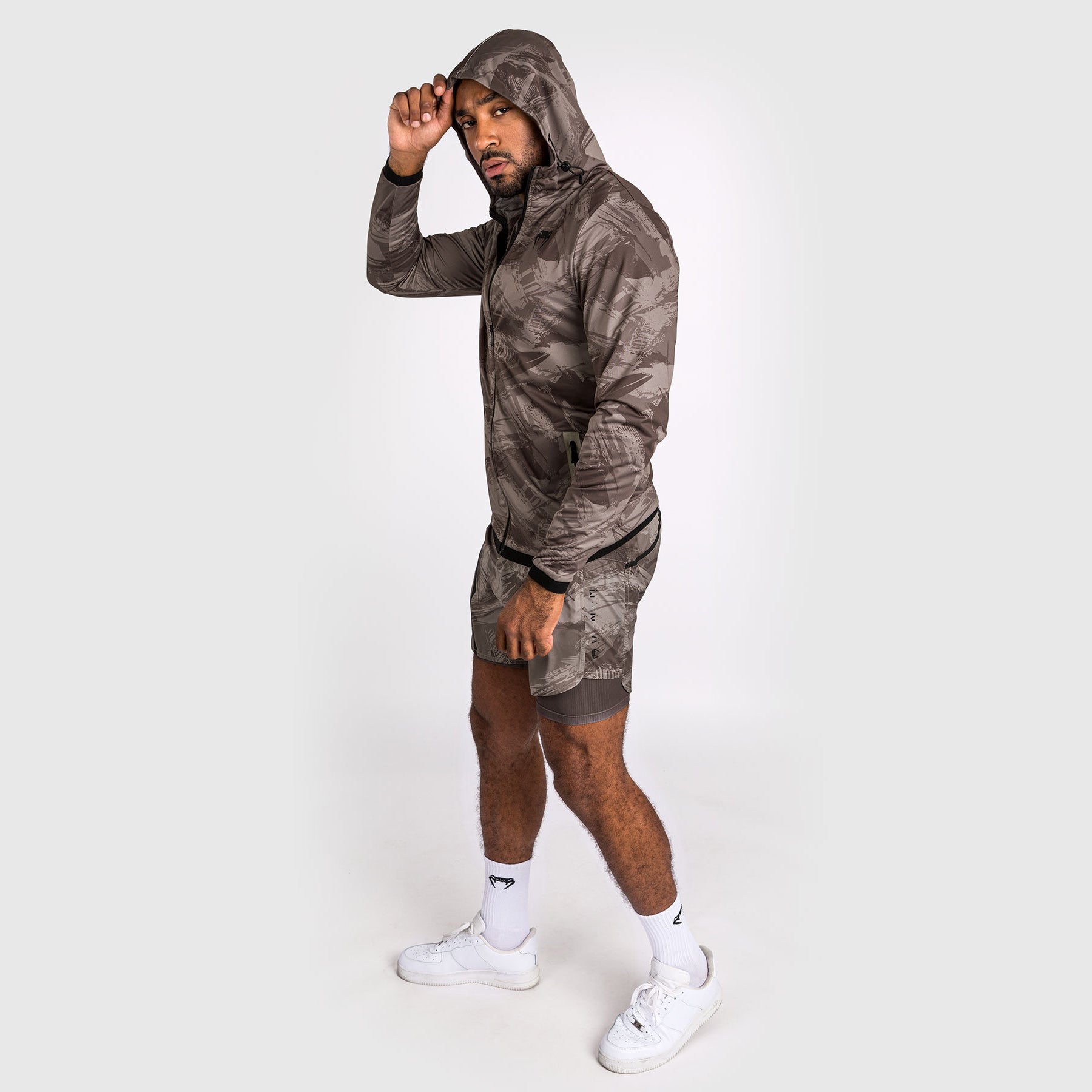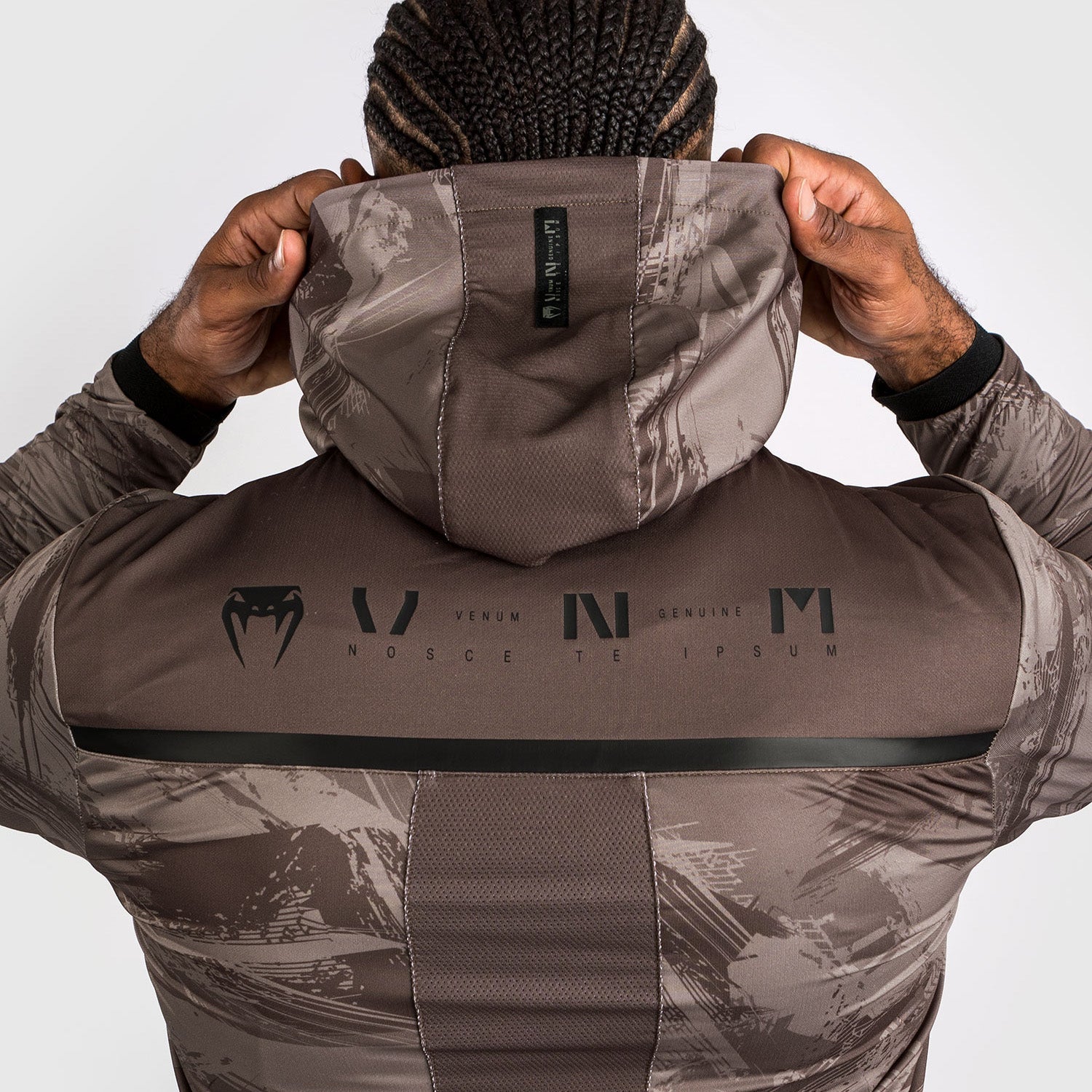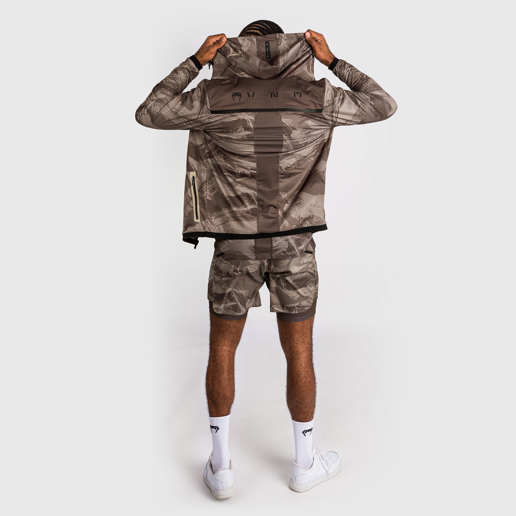 L'imprimé camouflage à coups de pinceau en Sable confère un style urbain au short, tandis que le logo Venum est apposé sur la poitrine. La phrase latine "Nosce te ipsum" ("Connais-toi toi-même" - Socrate), accompagnée du logo Venum, figure dans le dos.
