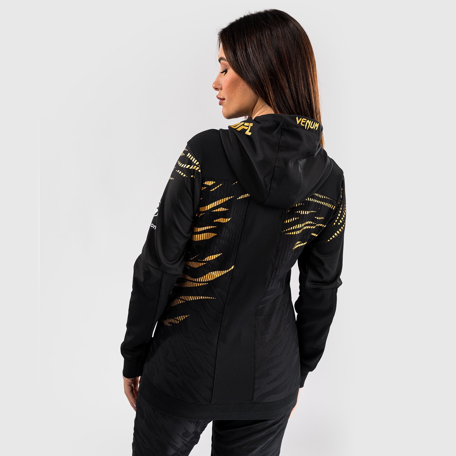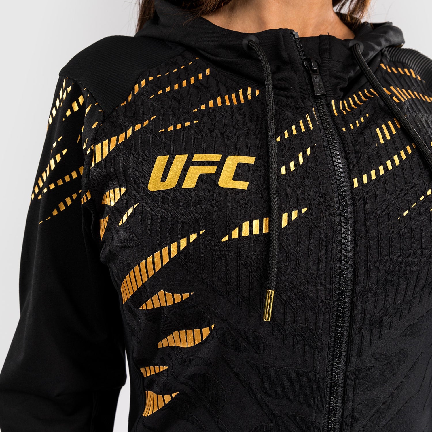 Le sweat à capuche de sortie pour femmes UFC Fusion par Venum présente deux poches zippées, ainsi qu'une capuche doublée en mesh avec cordons de serrage réglables. Les poignets et le panneau intérieur des bras sont fabriqués en tissu extensible de qualité supérieure, permettant aux athlètes de retirer leurs sweats à capuche sans enlever leurs gants. Cette combinaison noir/or est réservée aux champions de l'UFC.