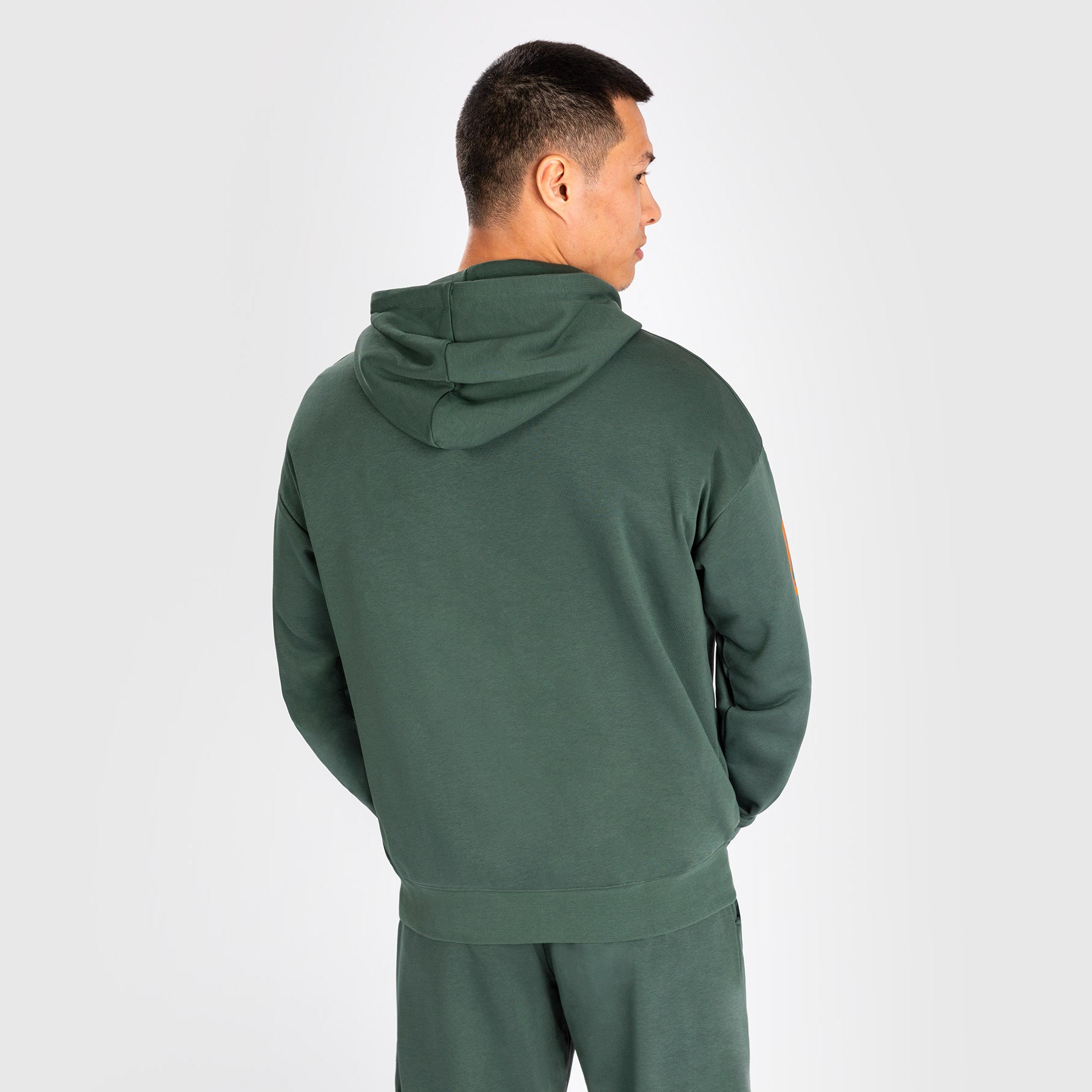 Le sweat à capuche Venum Vortex XL Lite pour hommes, en coloris kaki, est doté d'une poche kangourou pratique à l'avant, ornée du logo Venum brodé en orange au centre de la poitrine. Des graphiques subtils rehaussent la manche et la hanche, également en orange.