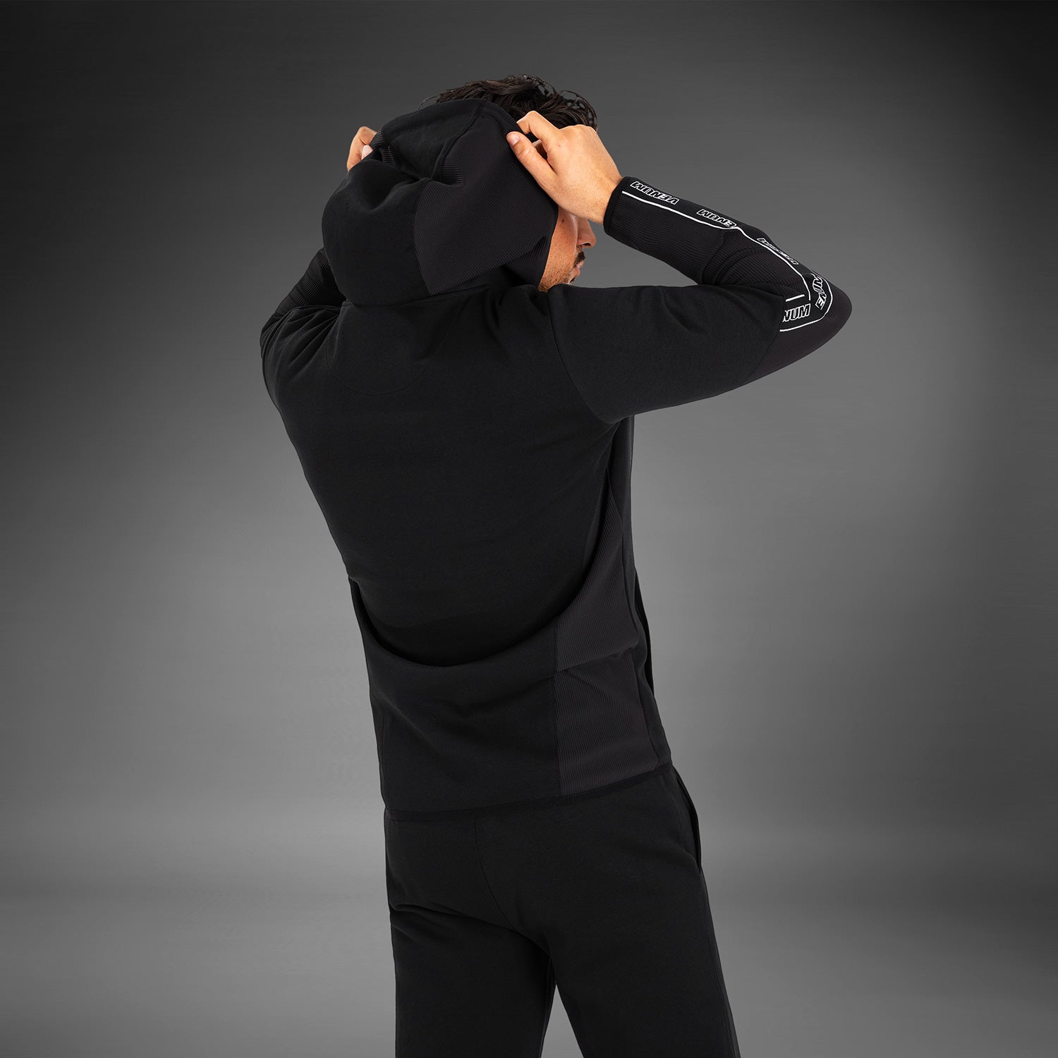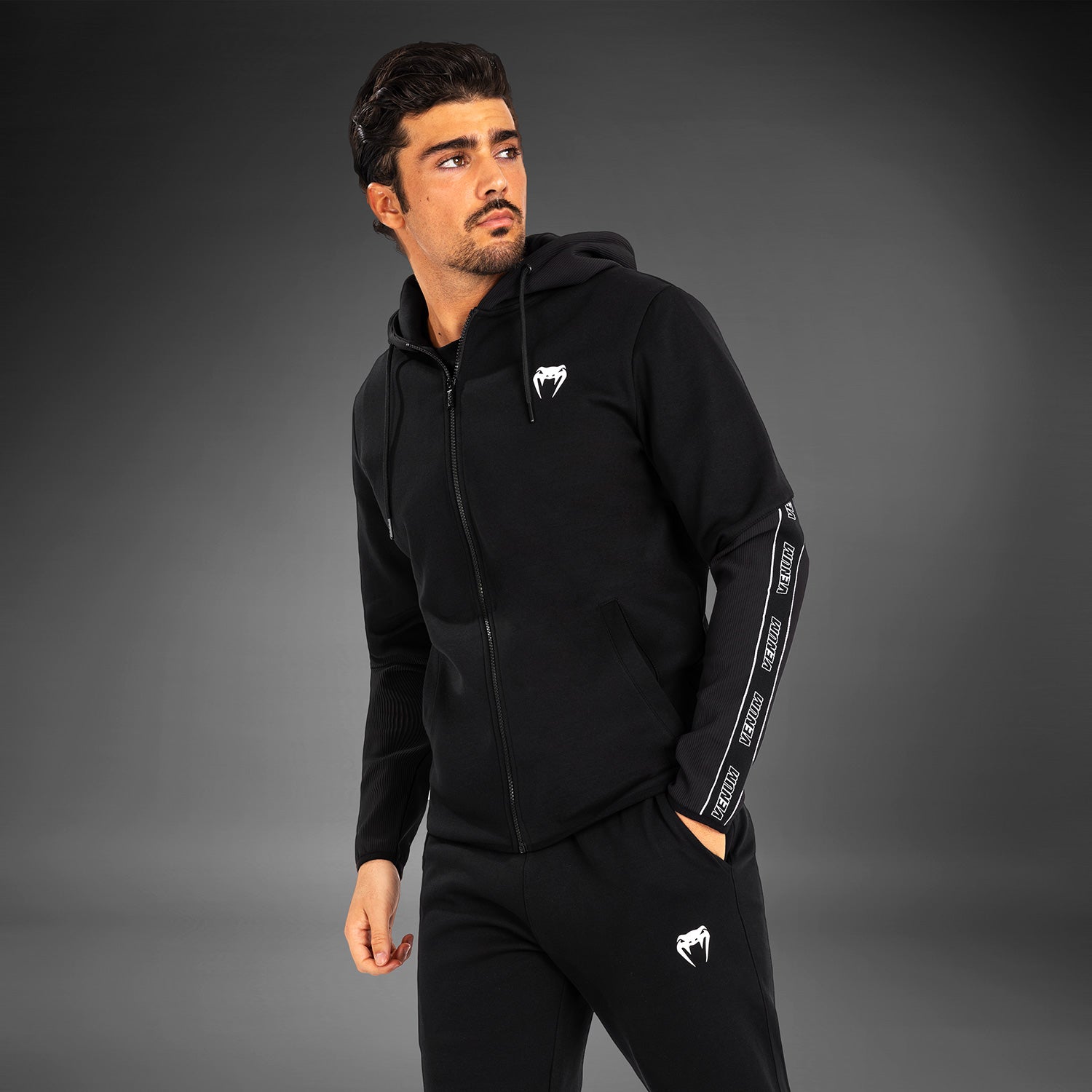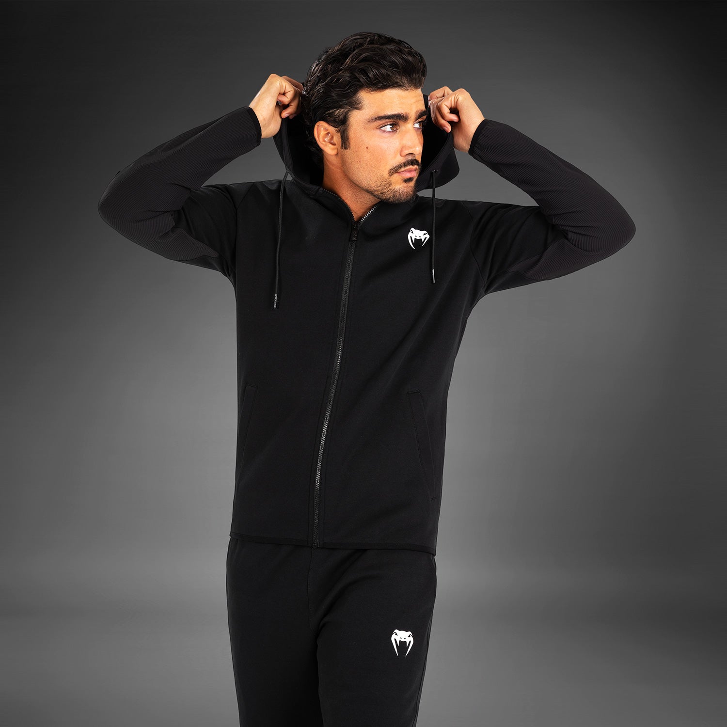 Ce modèle noir présente une rupture ton sur ton au niveau des manches, de la capuche et du dos, avec des détails de marque sur le bas de la manche. Le logo Venum en forme de tête de serpent apparaît en blanc sur la poitrine.