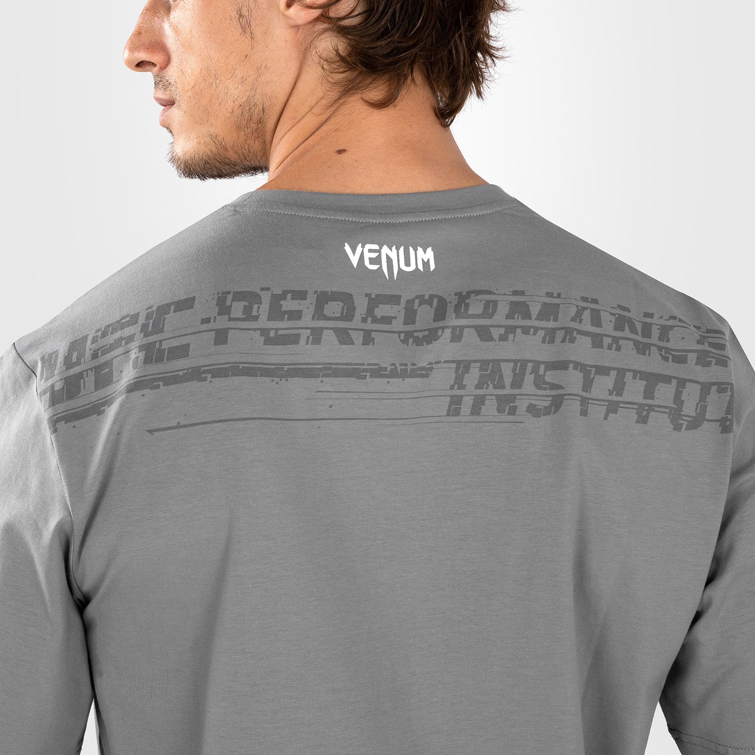Ce tee-shirt gris présente le graphisme dynamique de la collection en gris foncé dans le dos, ainsi que les logos UFC Performance Institute et Venum sur la poitrine.