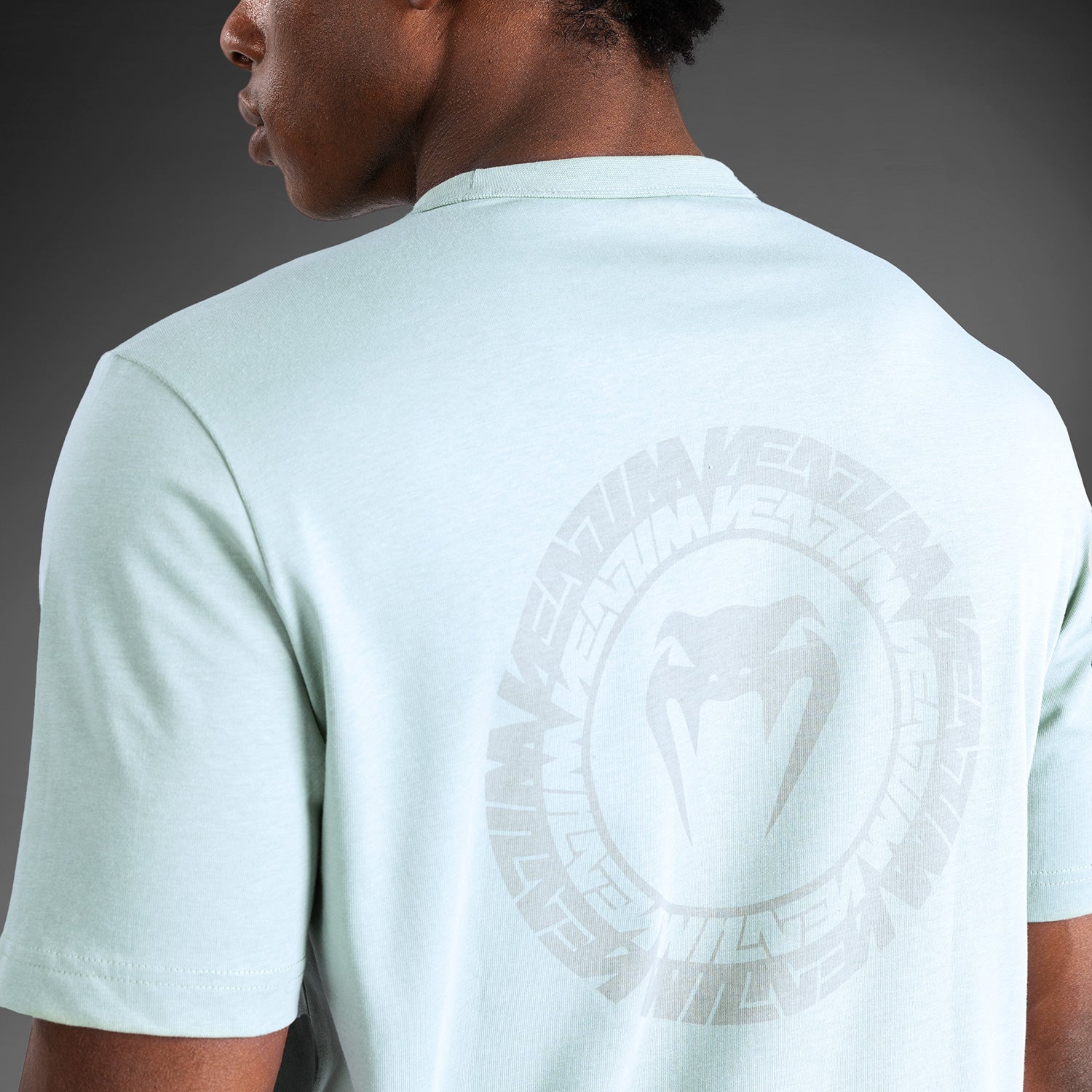 Le T-shirt Venum Vortex XL pour homme en bleu océan arbore le logo Venum brodé au centre de la poitrine en blanc. Le graphique du vortex en bleu ton sur ton couvre le dos du t-shirt.