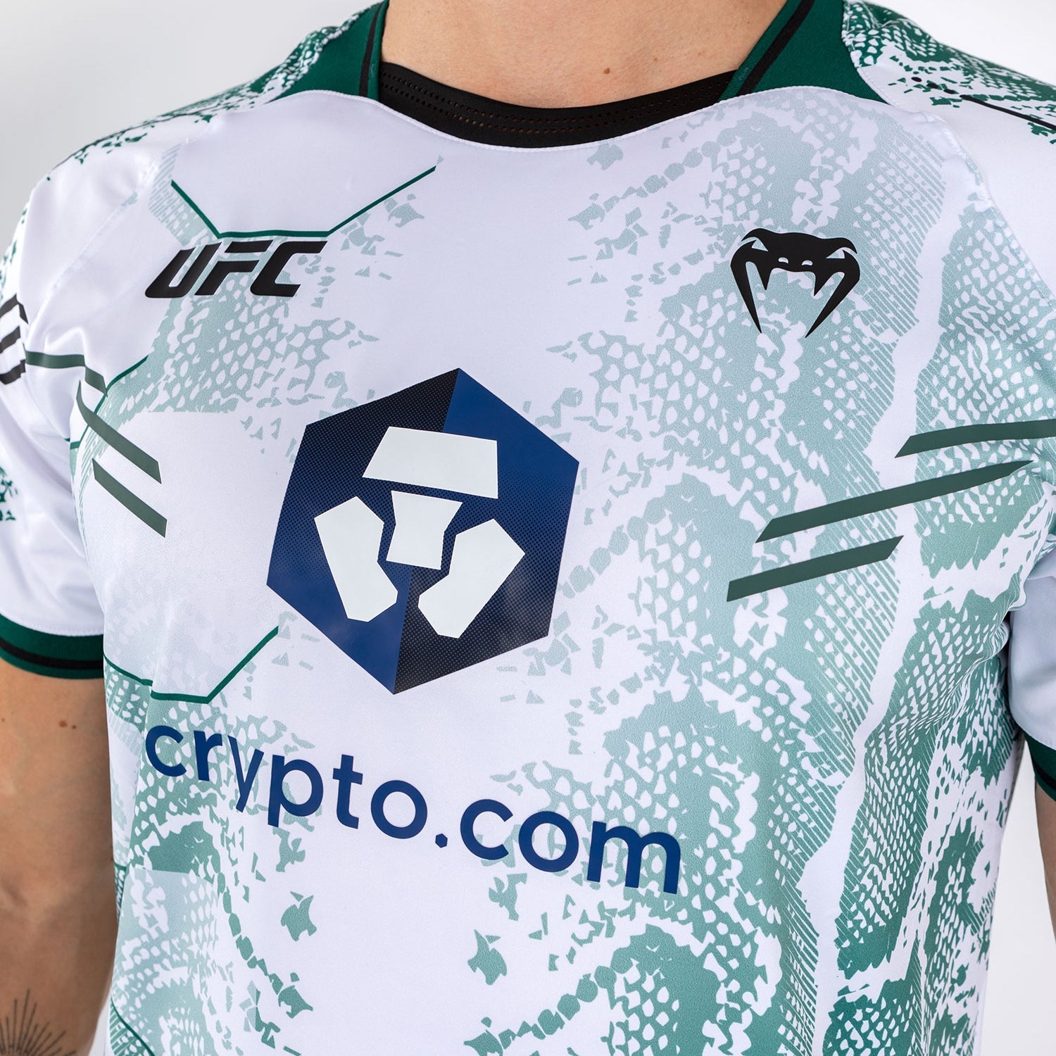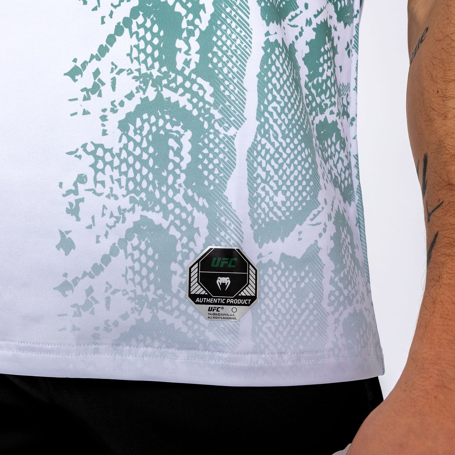 Le design audacieux de ce maillot blanc, avec des graphismes en peau de serpent vert émeraude et des détails de logo noirs, est un clin d'œil à l'expérience de l'adrénaline que représente le fait de pénétrer dans l'Octogone.