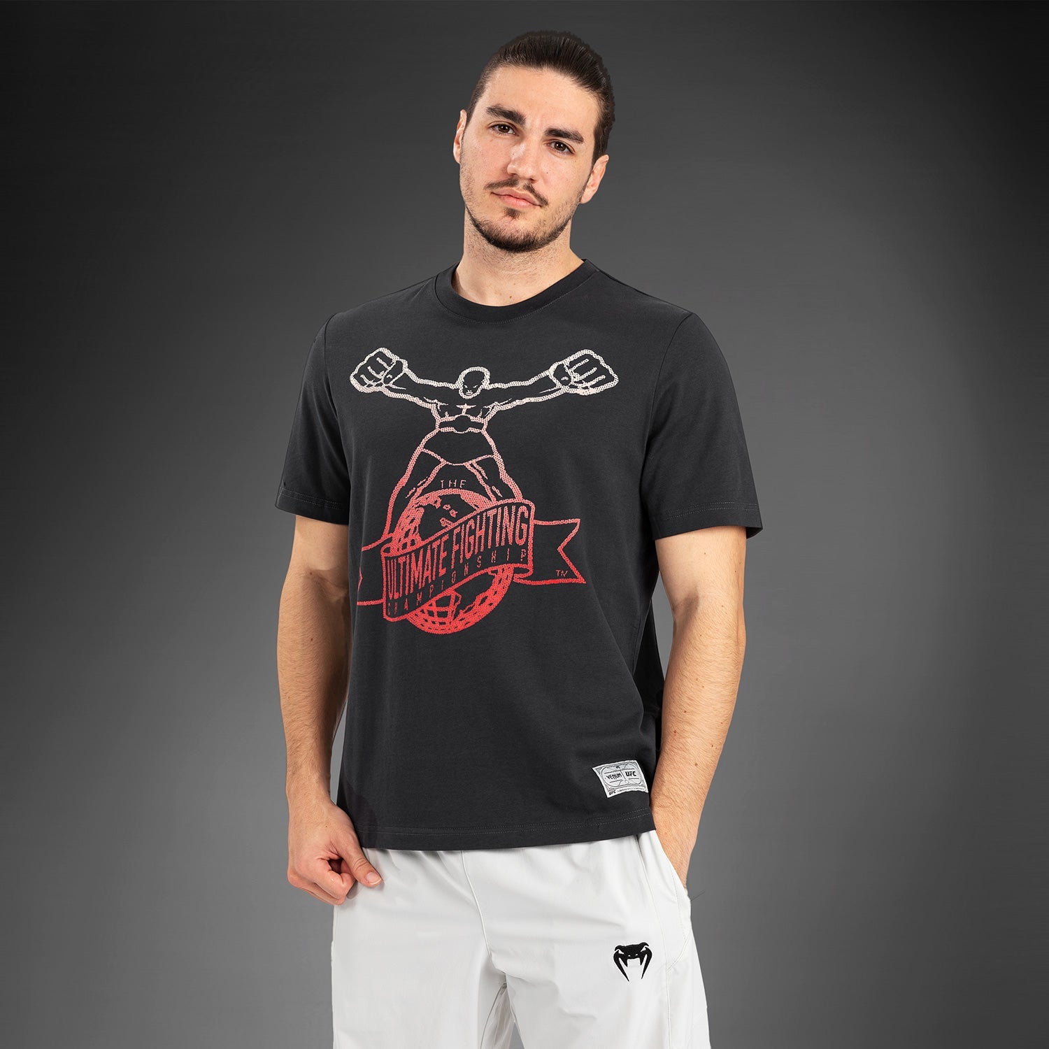 Sur ce T-shirt graphique noir à col ras du cou, le logo emblématique Ulti-Man en gris occupe le devant de la scène, tandis qu'un écusson de marque se trouve sur la hanche. Le logo Venum, également gris, est apposé dans le cou arrière.