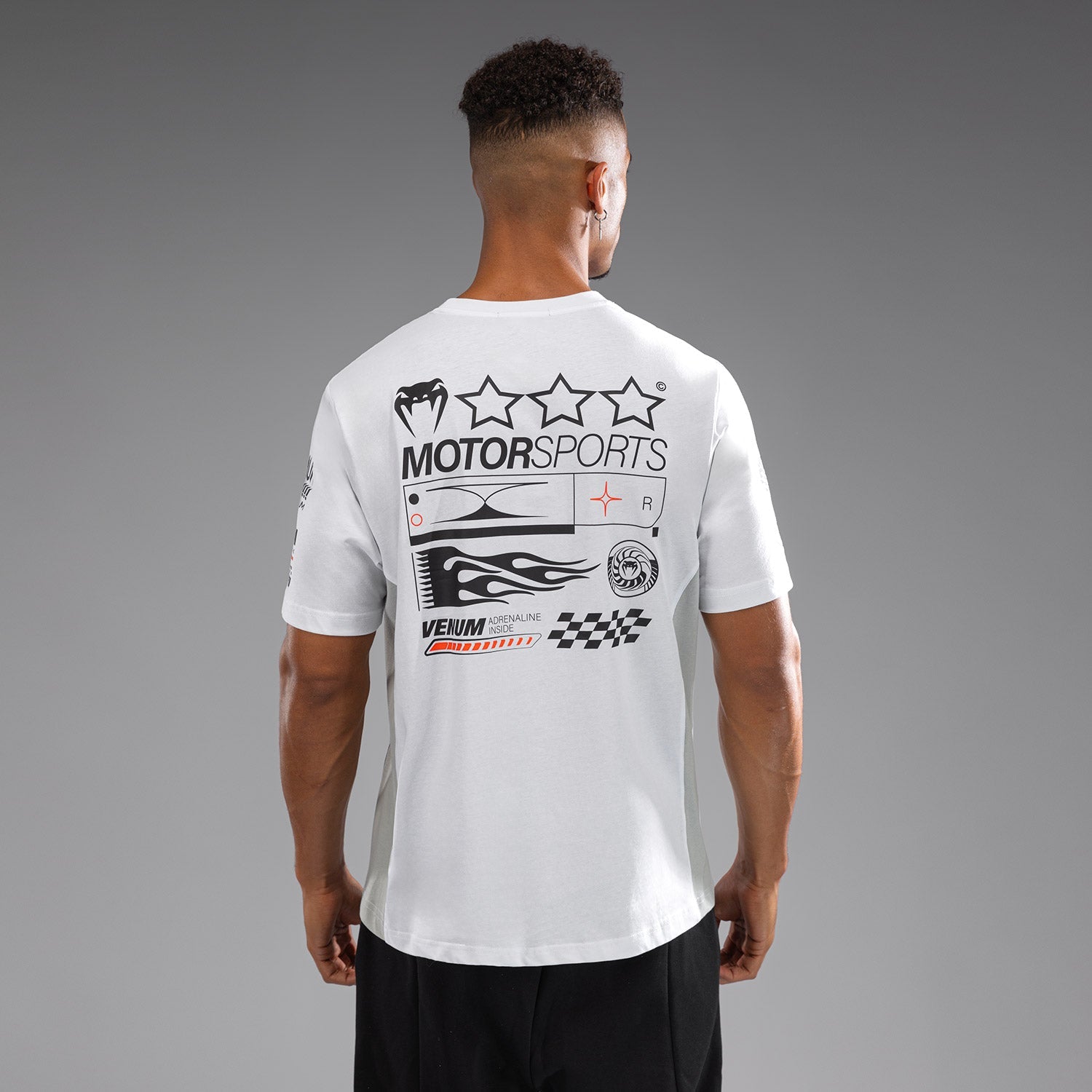 Le T-shirt Venum Motorsport en blanc neige est un tee-shirt à col rond de coupe régulière avec des panneaux gris contrastants sur les côtés. Doté de patchs imprimés et brodés orange et noir inspirés par les sports automobiles de Venum, ce t-shirt est prêt pour la piste !