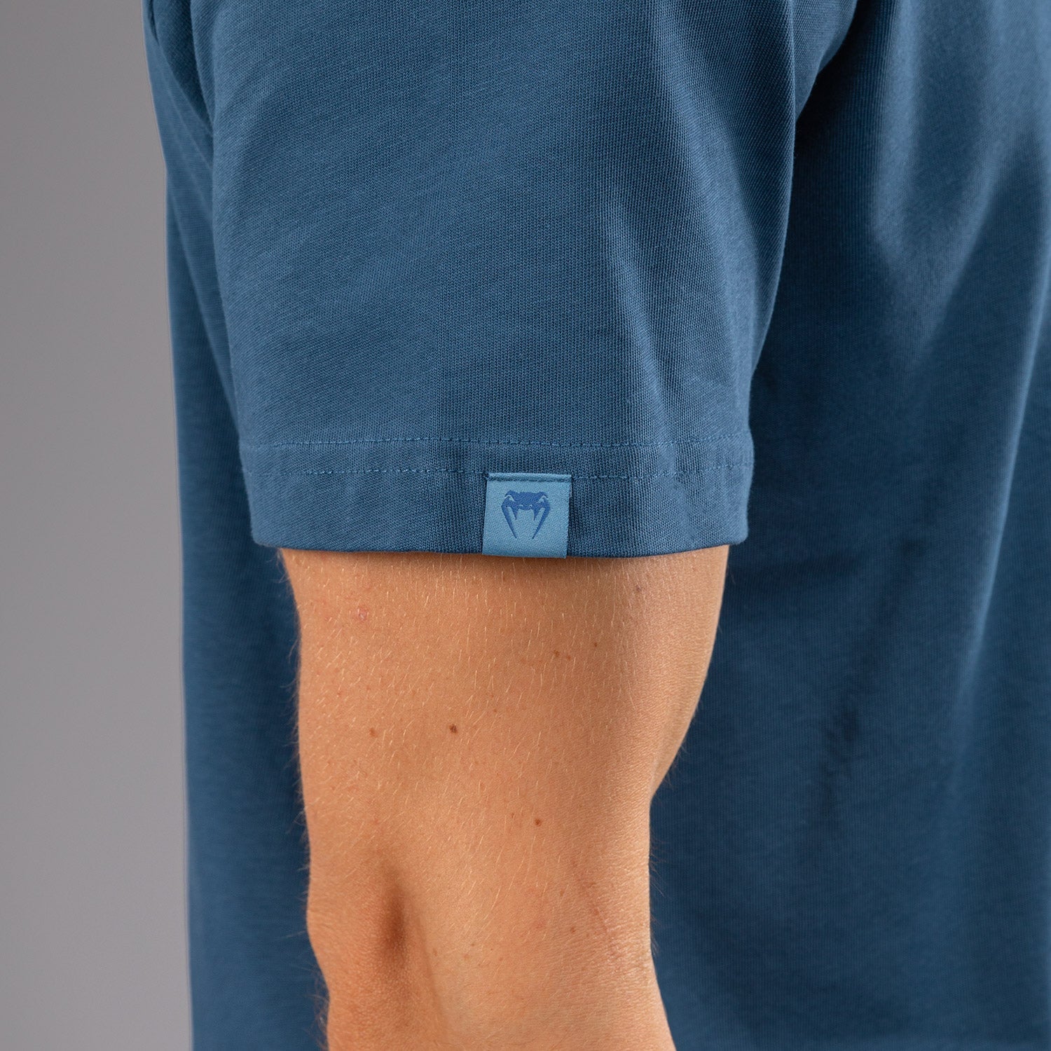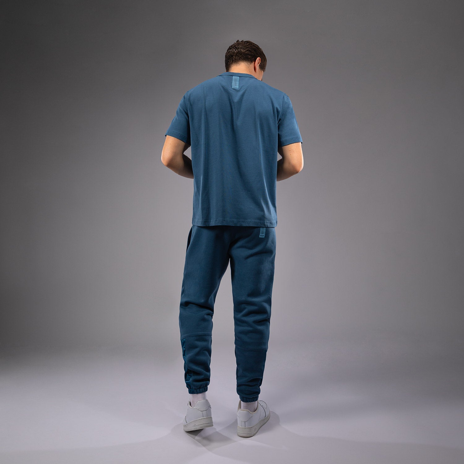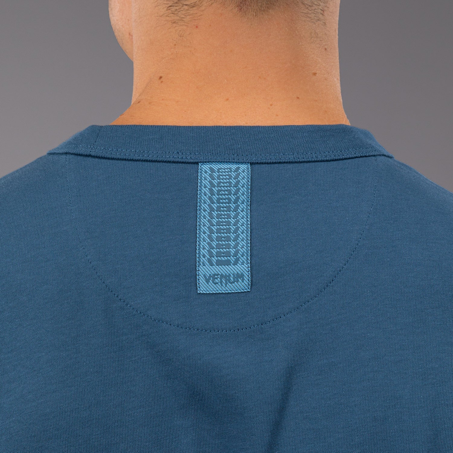Le T-shirt Silent Power en Bleu Paon se distingue par son col rond et ses manches courtes, agrémenté d'un petit logo ton sur ton sur la poitrine et d'un motif logo au dos du col.