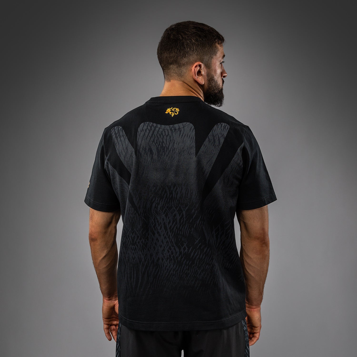 Le design de ce t-shirt présente des graphismes sublimés noirs et gris élégants qui évoquent la fourrure du loup. Des touches dorées de co-branding soulignent la puissance de cette collaboration MMA.