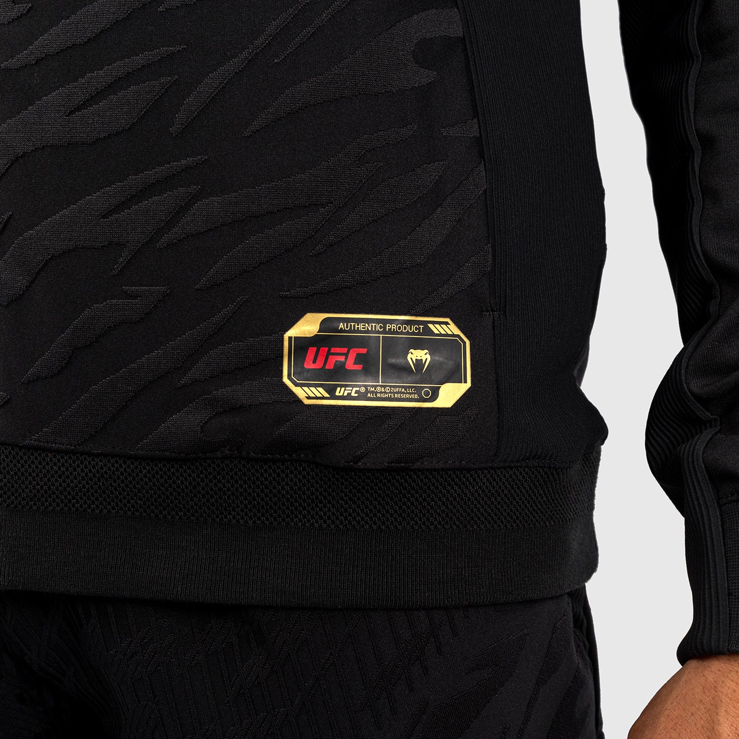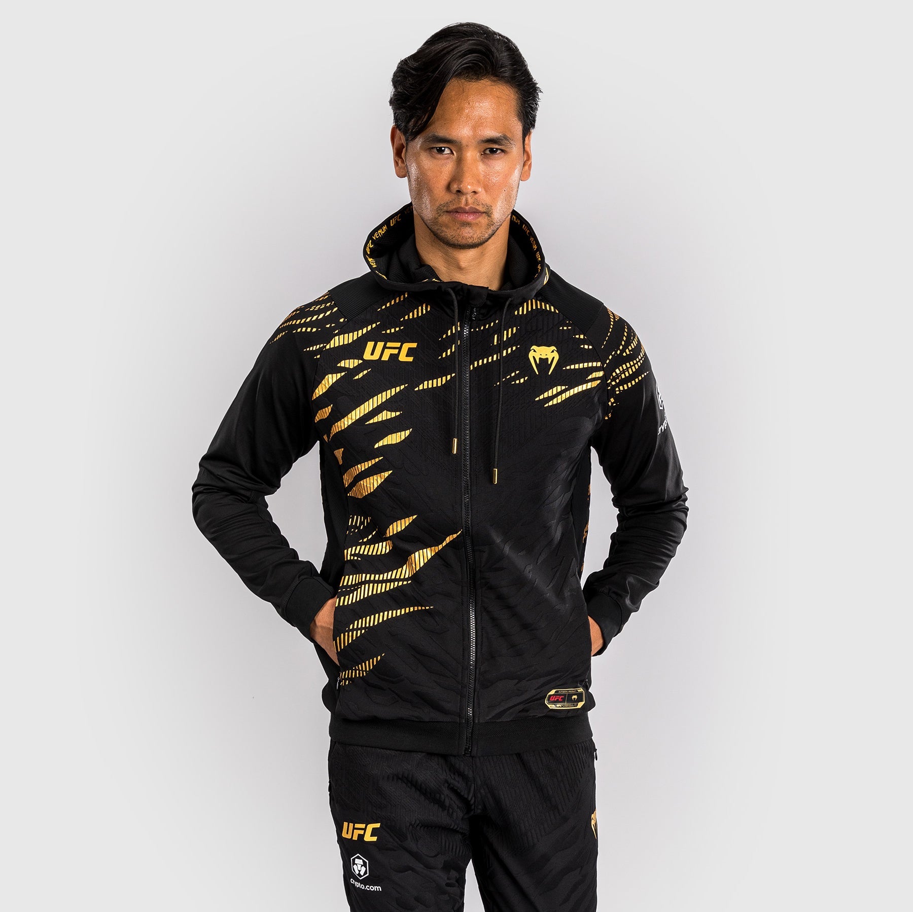 Le hoodie de sortie pour hommes UFC Fusion par Venum présente deux poches zippées, ainsi qu'une capuche doublée en mesh avec des cordons de serrage ajustables. Les poignets et le panneau intérieur des bras sont fabriqués avec un tissu extensible de qualité supérieure, permettant aux athlètes d'enlever leurs hoodies sans retirer leurs gants. Cette combinaison de couleurs noir/or est réservée aux champions de l'UFC.