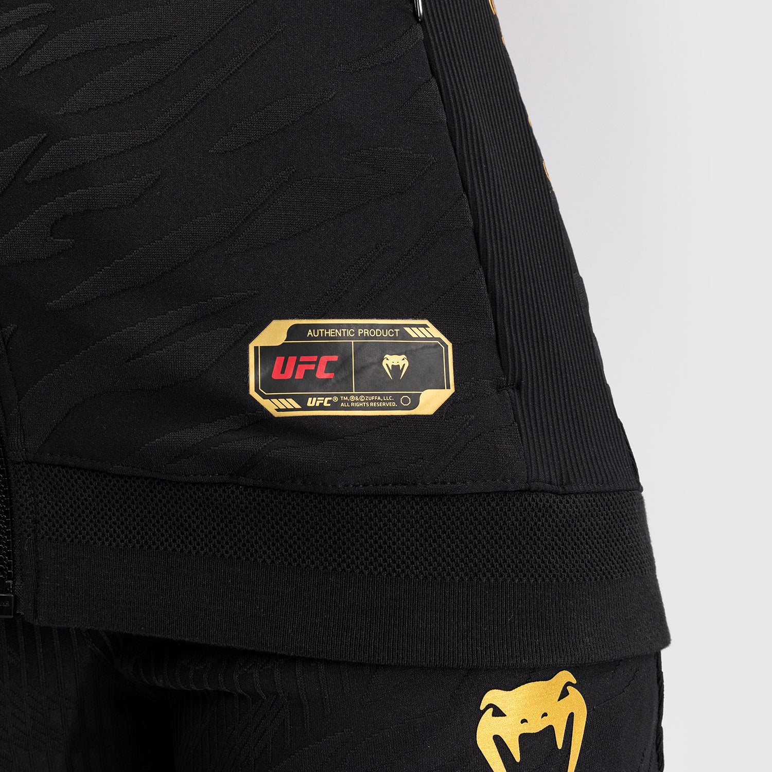 Le sweat à capuche de sortie pour femmes UFC Fusion par Venum présente deux poches zippées, ainsi qu'une capuche doublée en mesh avec cordons de serrage réglables. Les poignets et le panneau intérieur des bras sont fabriqués en tissu extensible de qualité supérieure, permettant aux athlètes de retirer leurs sweats à capuche sans enlever leurs gants. Cette combinaison noir/or est réservée aux champions de l'UFC.