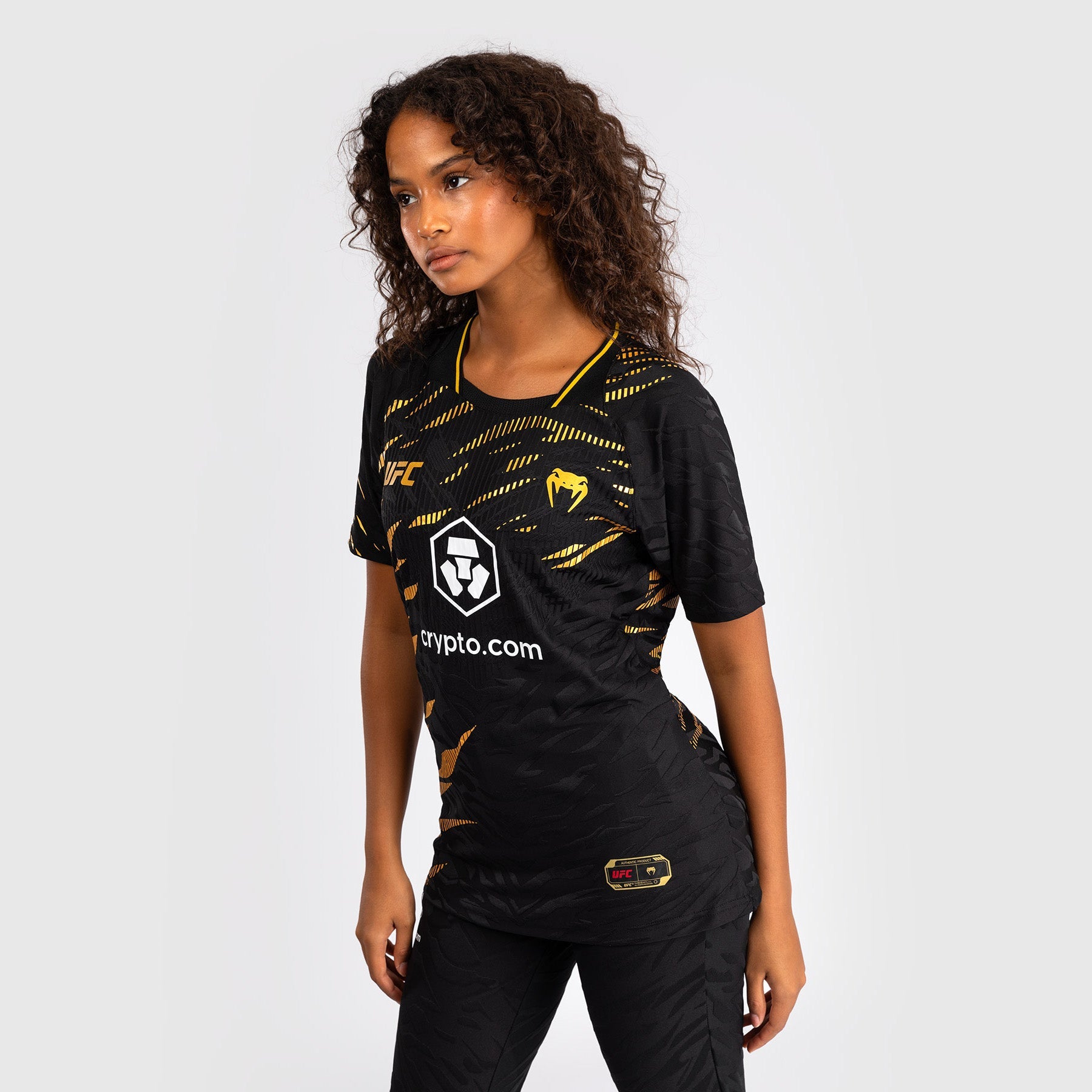 Le maillot de sortie pour femmes UFC Fusion par Venum Authentic Fight Night est une chemise de performance légère avec suffisamment d'élasticité pour bouger avec vous. Vous resterez à l'aise et au frais grâce au tissu Dry-Tech de la chemise, même lors des séances d'entraînement les plus intenses. Cette combinaison de couleurs noir/or est réservée aux champions de l'UFC.