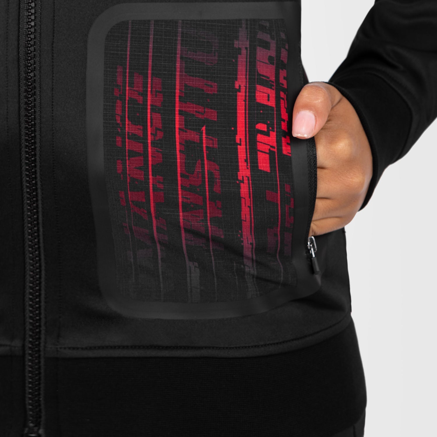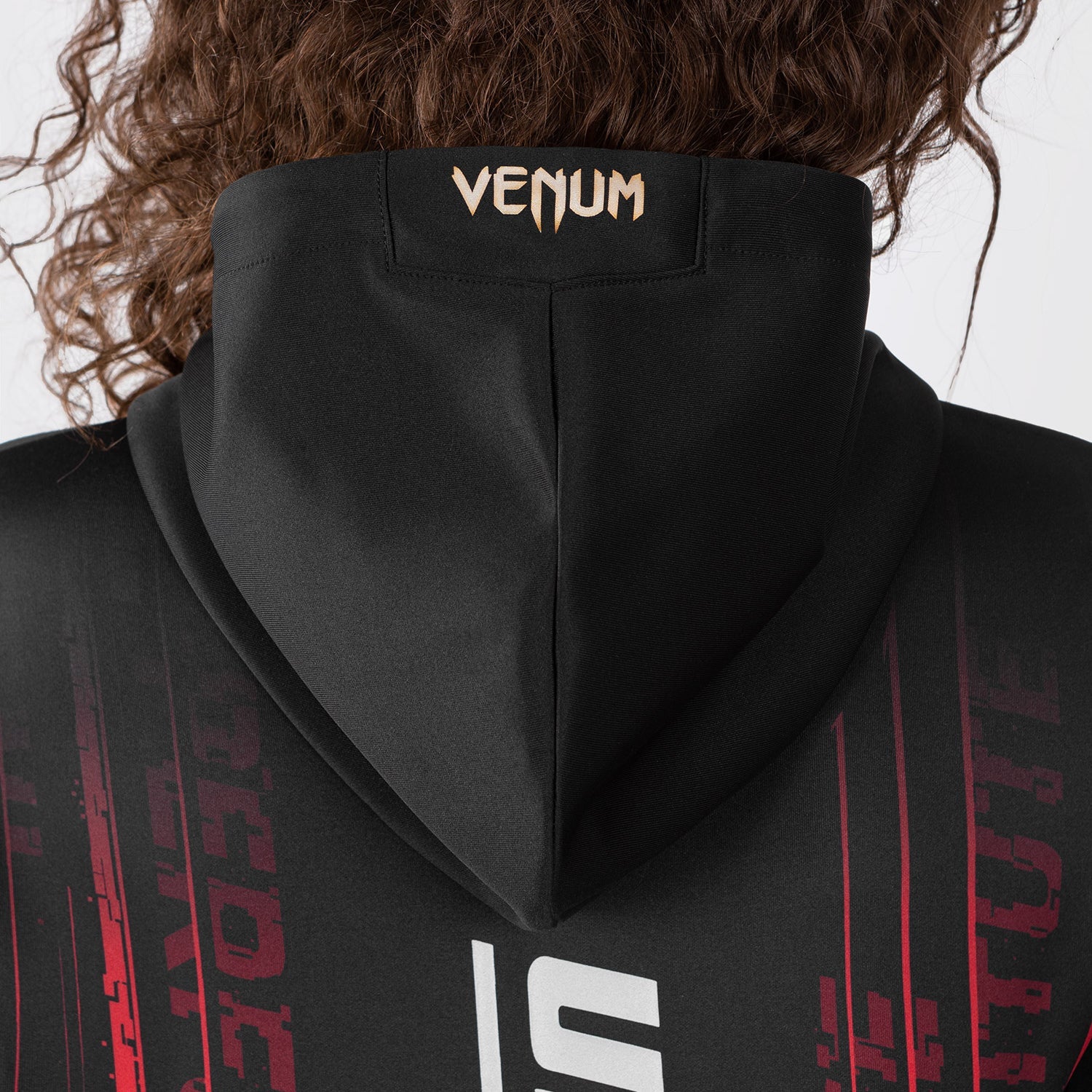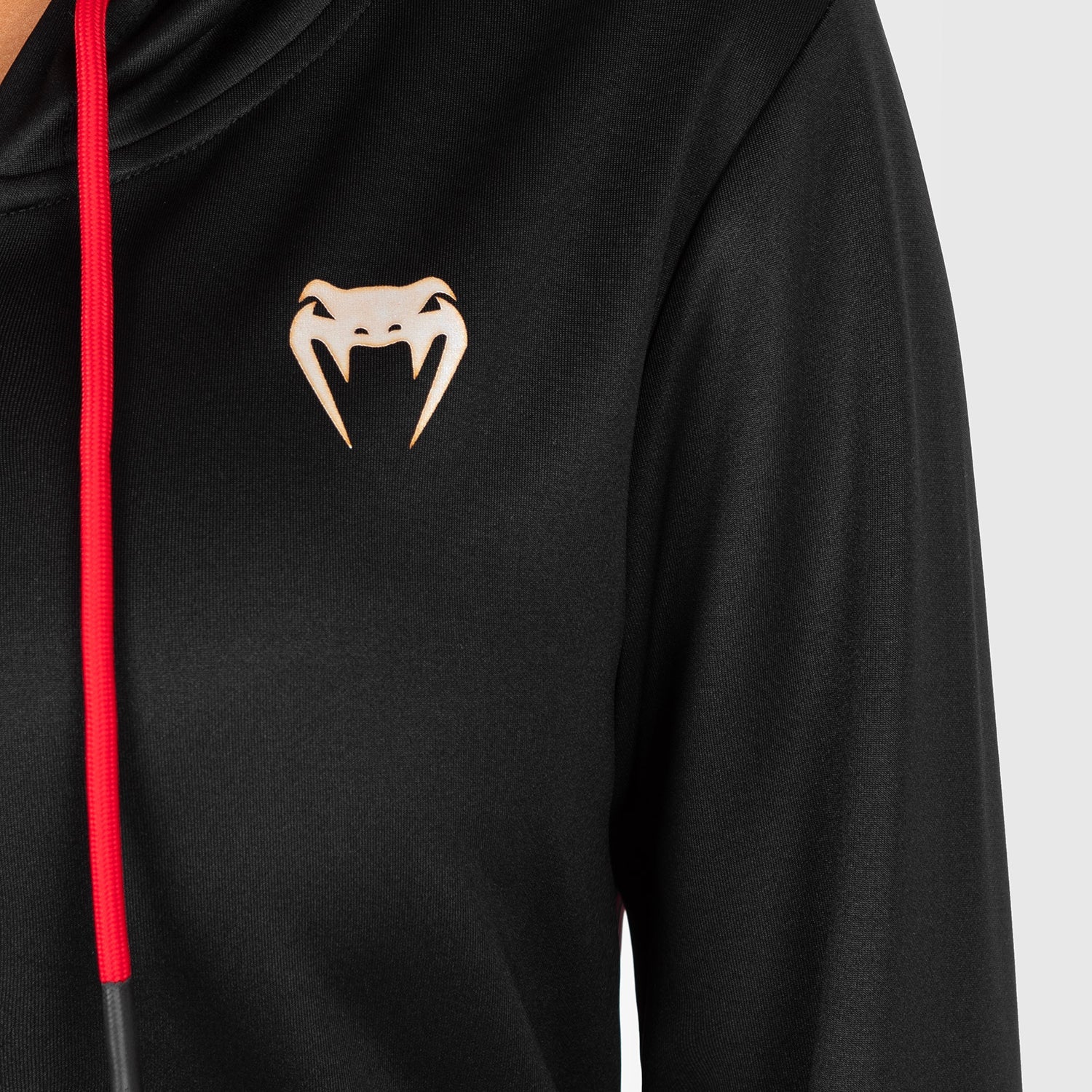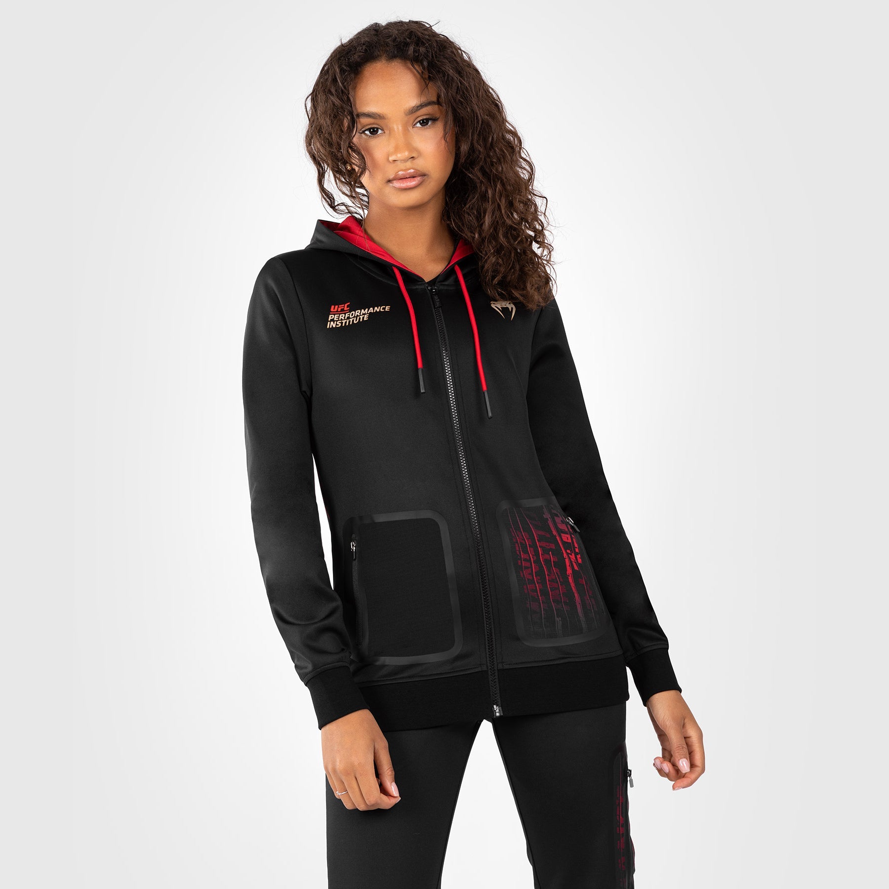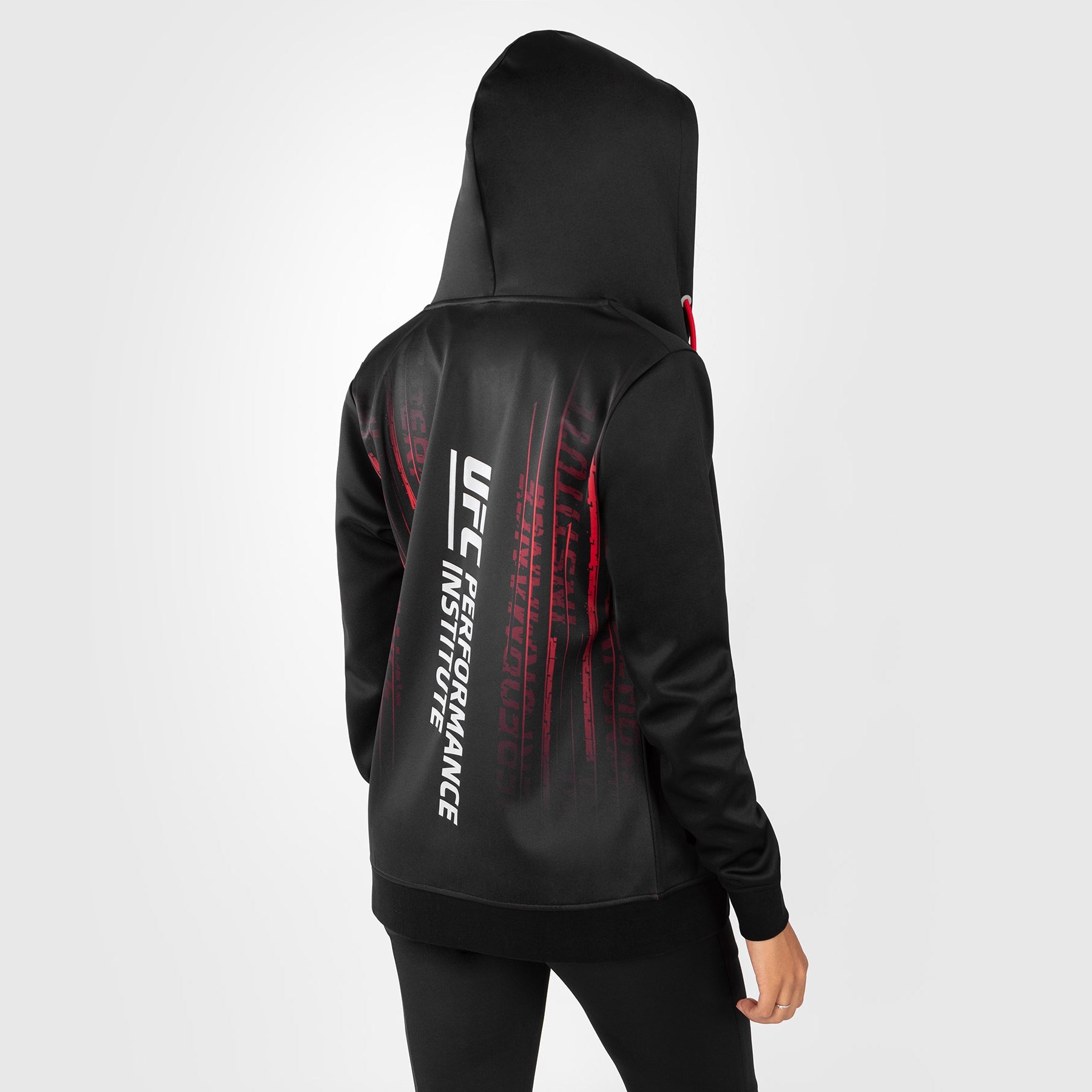 Cette veste à capuche haut de gamme pour femme, de couleur noire, présente une doublure rouge contrastante au niveau de la capuche et un cordon de serrage rouge. Le graphisme dynamique de la collection couvre le dos du sweat à capuche et la poche avant, avec les logos UFC Performance Institute et Venum sur la poitrine.