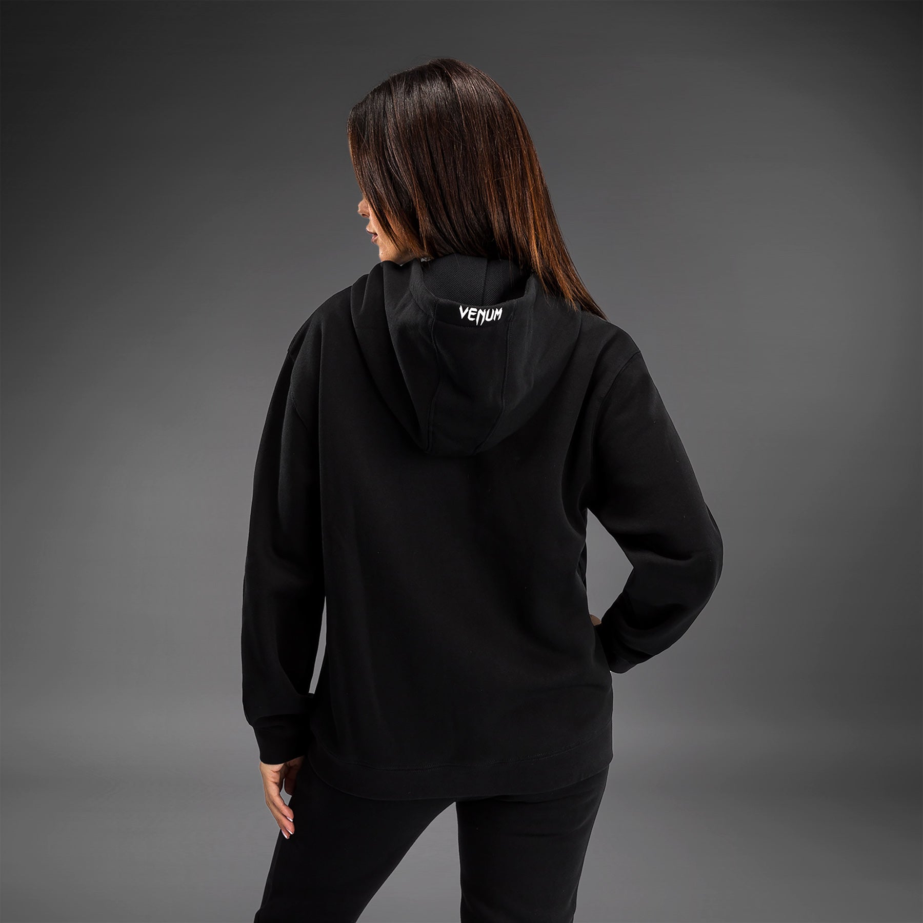 Le sweat à capuche zippé Replica UFC Fusion par Venum pour femmes dispose de poches latérales ouvertes et d'une capuche avec cordon de serrage. Les logos Venum et UFC se trouvent sur la poitrine et la capuche.